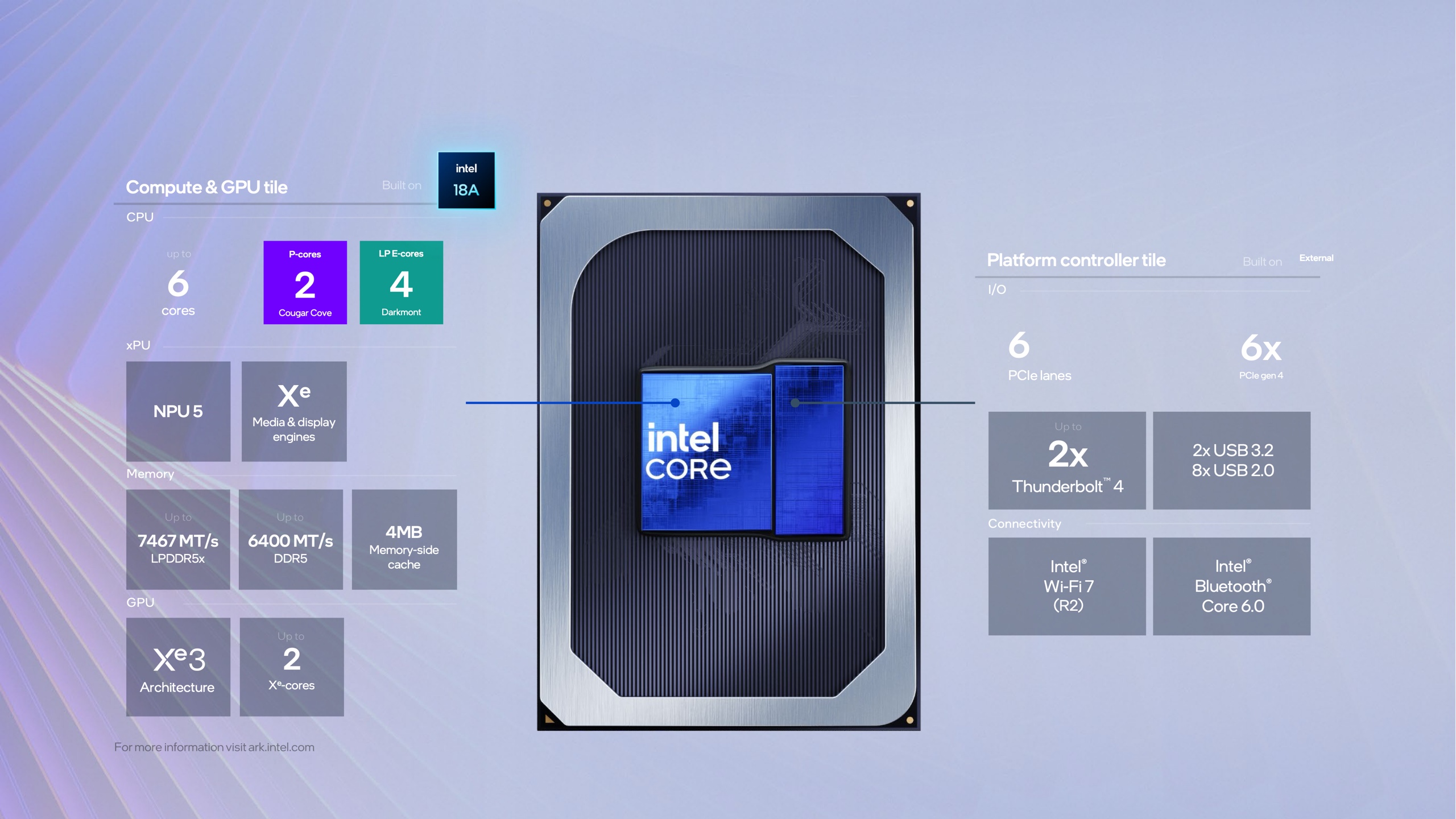 Each part is built from two silicon tiles: a compute tile that contains a CPU with up to two Cougar Cove P‑cores and four Darkmont E‑cores; an integrated GPU with one or two of Intel’s latest Xe3 GPU cores; and typically an NPU rated as high as 17 trillion operations per second (TOPS). A separate platform controller tile, manufactured on an unspecified non‑Intel process, provides up to two Thunderbolt 4 ports, Wi‑Fi 7 and Bluetooth 6.0 support, and six PCIe 4.0 lanes for external connectivity. All chips support up to 48GB of LPDDR5X‑7467 or up to 64GB of DDR5‑6400, and are specified with a 15 W base power level and a 35 W maximum boost power level.